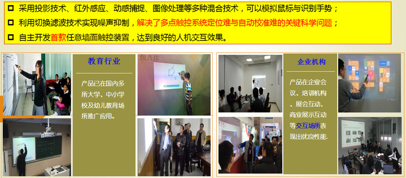 产品“Anywall Touch”通过采用物理设备投影仪与传感器,配套公司研发的“Anywall Touch”软件系统,实现将任意墙面变为可互动的触控屏,通过手势控制达到流畅自如的互动效果,具有定位精准、实时性强、性价比高、可系列化生产的特点,广泛适用于学校教室、会展路演、培训机构等场所。