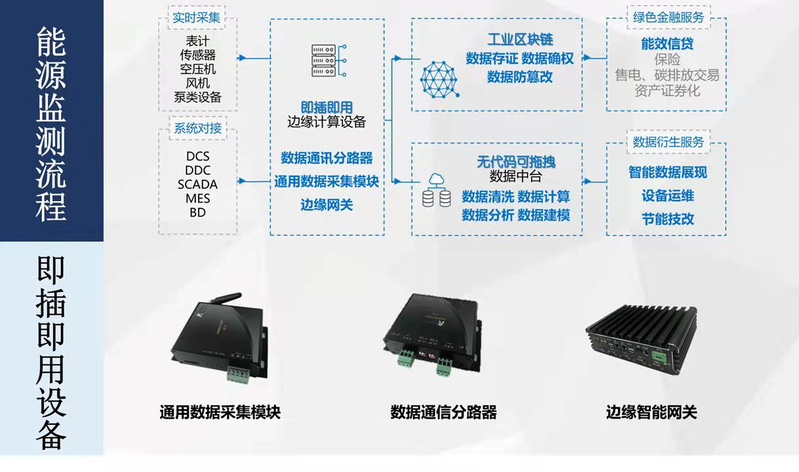 公司的产品以无代码可拖拽、即插即用为核心,同时能源管理系统可进行外围扩展,进而实现工序用能的精细化管理。用户侧为应用切入点,在能源数据采集及统计分析的基础上,形成面向多元化客户端的综合管理服务平台,包括用能单位、工业服务商、政府职能部门等。通过整合云计算、边缘计算设备、大数据(采集、存储、分析、预测等)、区块链(智能合约)、人工智能(人脸识别、无人机等)、安全技术(数据加密、防攻击等)、专业服务解决方案等,在提升各方管理服务水平的同时,实现平台服务链无缝对接,形成了以工业互联网平台为基础上的综合能源服务产业链。平台建设完成后,具有能源计量仪表的自动抄表、能源消耗数据分析、能源消耗KPI指标体系考核等功能。并且基于平台获得的数据,后续可以推动企业实行碳交易、售电,也可以帮助银行评估企业信用,为企业提供金融贷款。构建以“工业互联网能源大数据平台”为技术支撑的区域综合能源服务生态圈是本公司的愿景。