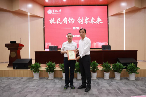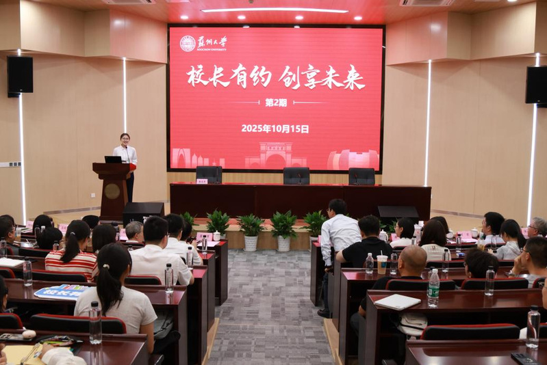 10月15日晚,苏州大学2025年“校长有约”第二期活动在东校区财经科学馆顺利举行。苏州大学2008级校友、苏州银行股份有限公司党委书记、董事长崔庆军应邀出席,校长张桥,校党委副书记、副校长沈明荣,商学院院长冯博,商学院执行院长邓天虎,以及苏州银行股份有限公司相关领导、校内各职能部门负责人出席活动。各学院(部)学生代表齐聚一堂,与优秀校友共话职业规划之路。活动由苏州大学创新创业学院所属的学生社团创业人社区理事长、商学院本科生戴欣妍主持。