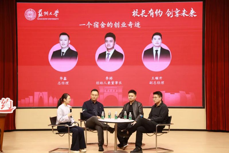 11月29日下午,苏州大学第4期“校长有约”活动于本部红楼学术报告厅成功举办。本期活动特邀计算机科学与技术学院2007级同宿舍三位校友——苏州派迅智能科技有限公司创始人兼董事长李游、总经理华鑫、副总经理王顺开重返母校,与师生共叙成长、共话创新。校长张桥,校党委常委、副校长张正彪,校党委常委、副校长王云杰,计算机科学与技术学院党委书记陈国凤,以及校内相关职能部门负责人出席活动。各学院(部)学生代表踊跃参与,聆听校友智慧,共探成长路径。活动由计算机科学与技术学院2025级本科生龙莹与青年教师龚晨联袂主持。