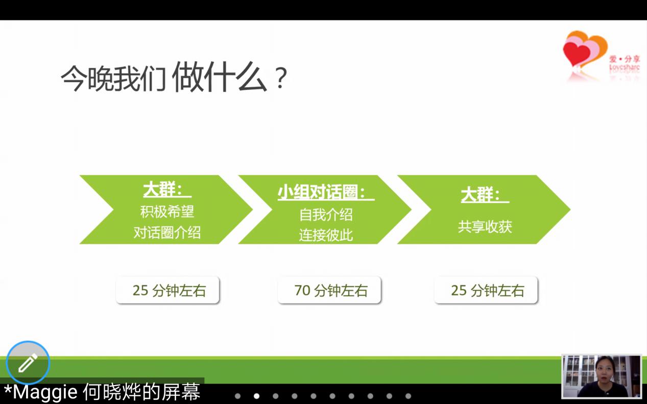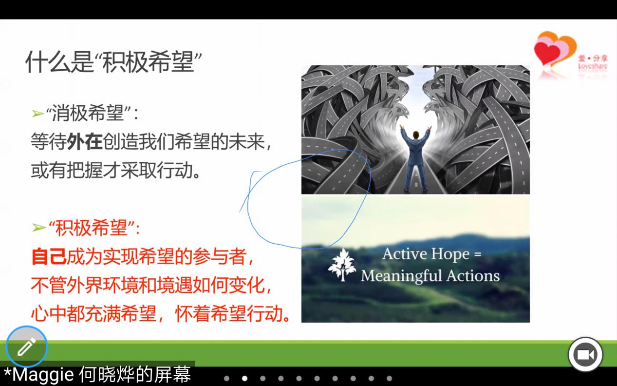 此次线上体验活动分为三个环节,第一个环节是 “积极希望”介绍;第二个环节是小组对话圈进行自我介绍,连接彼此;最后一个环节是共享收获。在第一个环节中,爱分享导师通过对比“消极希望”揭示了“积极希望”的内涵,并表示人人都能成为实现希望的参与者,不管外界环境和境遇如何变化,心中都能充满希望,怀着希望行动。爱分享导师还针对如何做到积极希望的问题提出了“积极希望”的本质:重建连接,然后结合生活中的例子对连接自我、连接彼此、连接世界的三个层次进行了由里到外地分析。