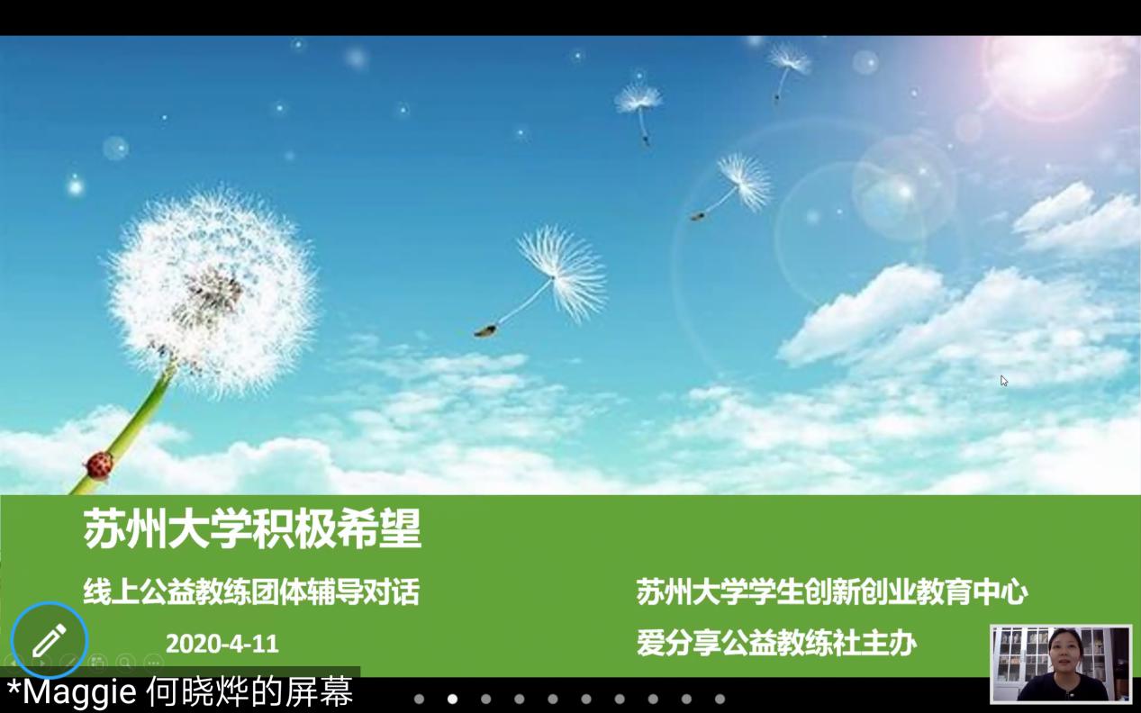 4月11日晚,由苏州大学学生创新创业教育中心和苏州市爱分享公益教练社联合举办的积极希望线上分享体验会顺利开展。本次线上活动结合大群分享与小组体验的形式在曙目APP中进行,受到了同学们的踊跃参与。