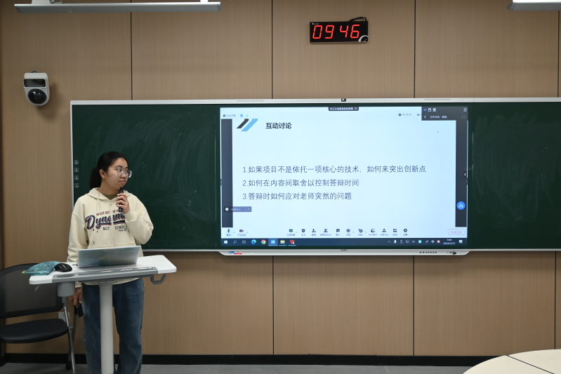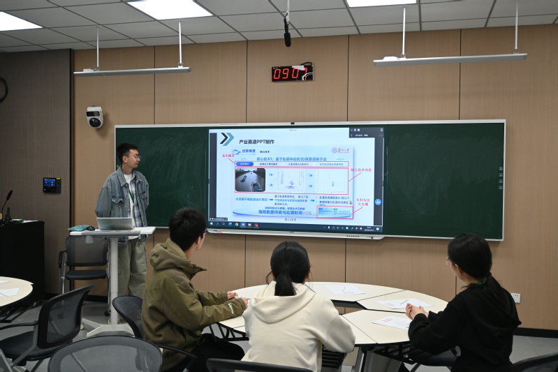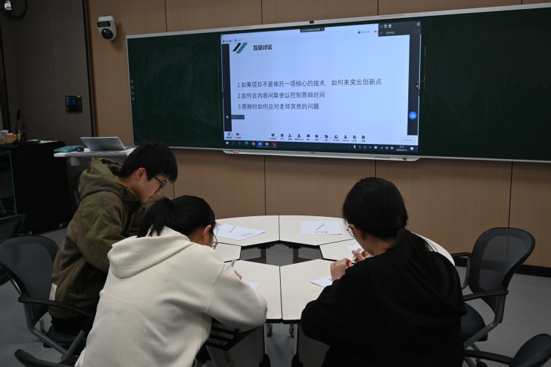 在圆桌会议上,姜皓同学首先为大家讲解了创业赛道PPT的制作并展示了参赛要求。接着,姜皓同学讲述了参加创新大赛的心路历程并还强调要注重学科交叉、团队协作件。最后,姜皓同学展示了三个问题,学生们一桌一组展开讨论并进行了回答,姜皓同学也分别做出了讲解。姜皓同学条理清晰的经验分享让学生们受益匪浅。