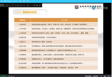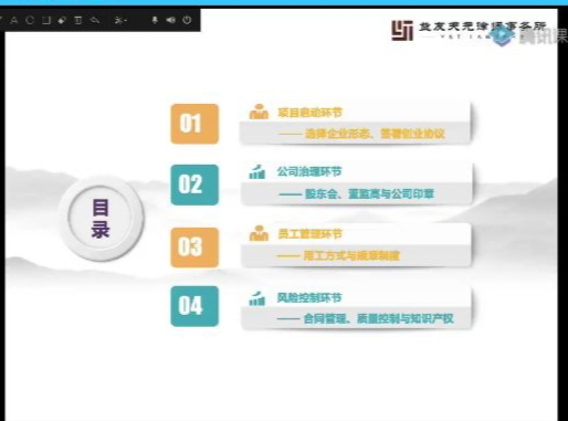 第三场讲座是由江苏益友天元律师事务所执业律师矫健律师所讲授,讲座主题为科普创业法律知识,主要针对初创团队,初创企业的活动及业务特点,提示学员在创业过程中需要注意规避的法律风险。讲座分为项目启动环节——选择企业形态,签署创业协议,公司治理环节——股东会,董监高与公司印章,员工管理环节——用工方式与规章制度,风险控制环节——合同管理,质量控制与知识产权四个环节来讲解。