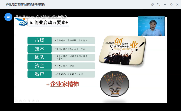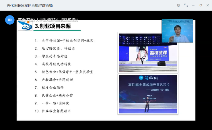 本次线上云讲座邀请到中国高校创新创业孵化器联盟理事长,江苏亮点光电科技有限公司董事长蔡震,江苏省创业服务协会副会长、创业导师及项目专委会主任王阳以及北京新产教科技有限公司董事长马德富为参会者讲解此次线上培训会内容。