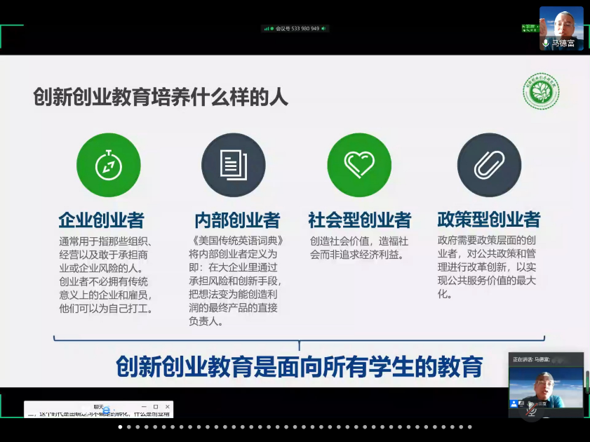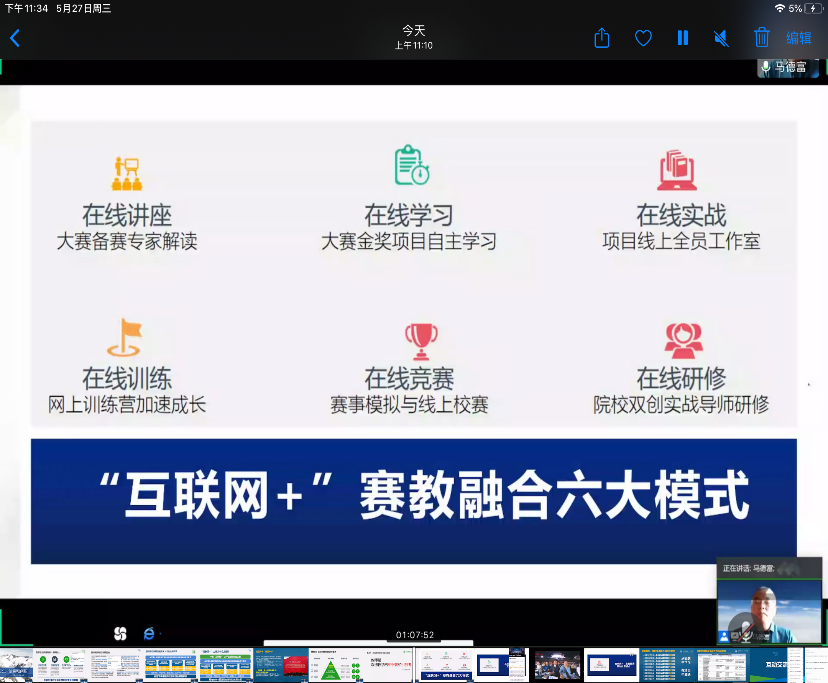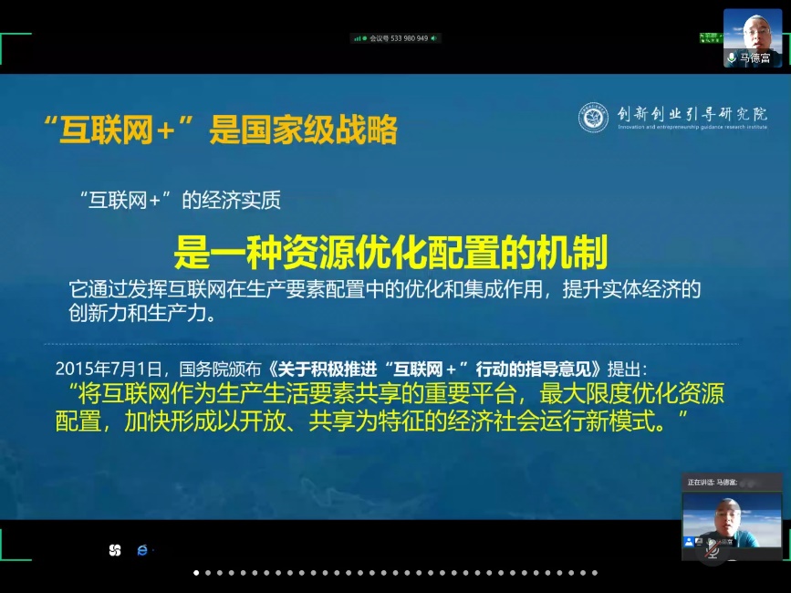培训第二日上午,天使投资人、北京新产教科技有限公司董事长马德富带来了“‘互联网+’时代赛教融合创新创业教育新模式”的主题内容。马老师首先从对“互联网+”和创新创业教育的概念理解出发,提醒与会老师必须充分理解其涵义,同时强调“创新创业教育是面向所有学生的教育”。从国家政策体制机制改革层面分析了创新创业教育与“互联网+”大赛之间“以赛促学、以赛促教、以赛促创”的关系,阐述院校创新创业课程体系、双创教学的基本范式、以及双创教师定位于能力模型的三大创新创业教育要点。针对此次疫情防控期间开展的线上双创教学,马老师还提出要充分发挥“互联网+”思维,帮助实现“赛教融合”的双创教育模式,给予青年大学生更多创新创业的成长机会与发展空间,真正做到实践育人。两个小时的授课从国家政策层面的高度为与会老师理清了创新创业教育的基本理念,获得了各大高校老师的一致好评。