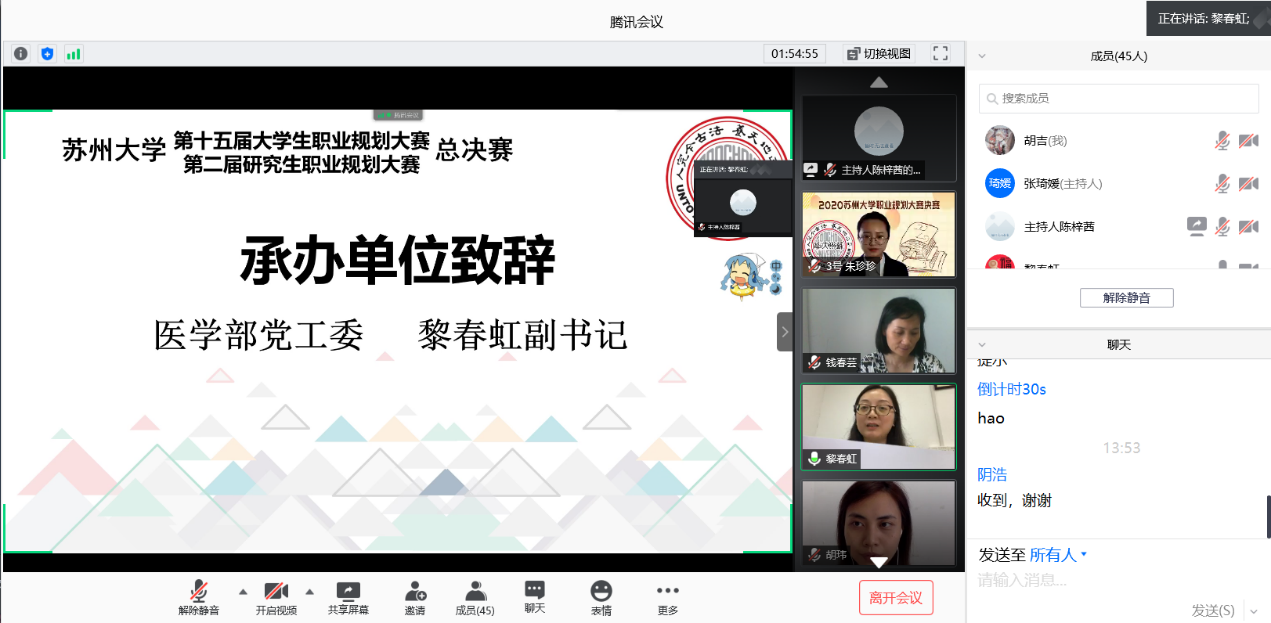 为全面落实立德树人根本任务,积极推进大学生职业生涯规划教育和创新教育,进一步提升大学生职业生涯规划能力,促进高校毕业生更高质量就业创业,由苏州大学学生创新创业教育中心、苏州大学党委研究生工作部主办,苏州大学医学部学工办、医学部锦程社承办的苏州大学第十五届大学生职业规划大赛暨苏州大学第二届研究生职业生涯规划大赛全校总决赛于6月10日14时在腾讯会议拉开了序幕。参加决赛的共有20位选手,其中14名本科生,6名研究生。