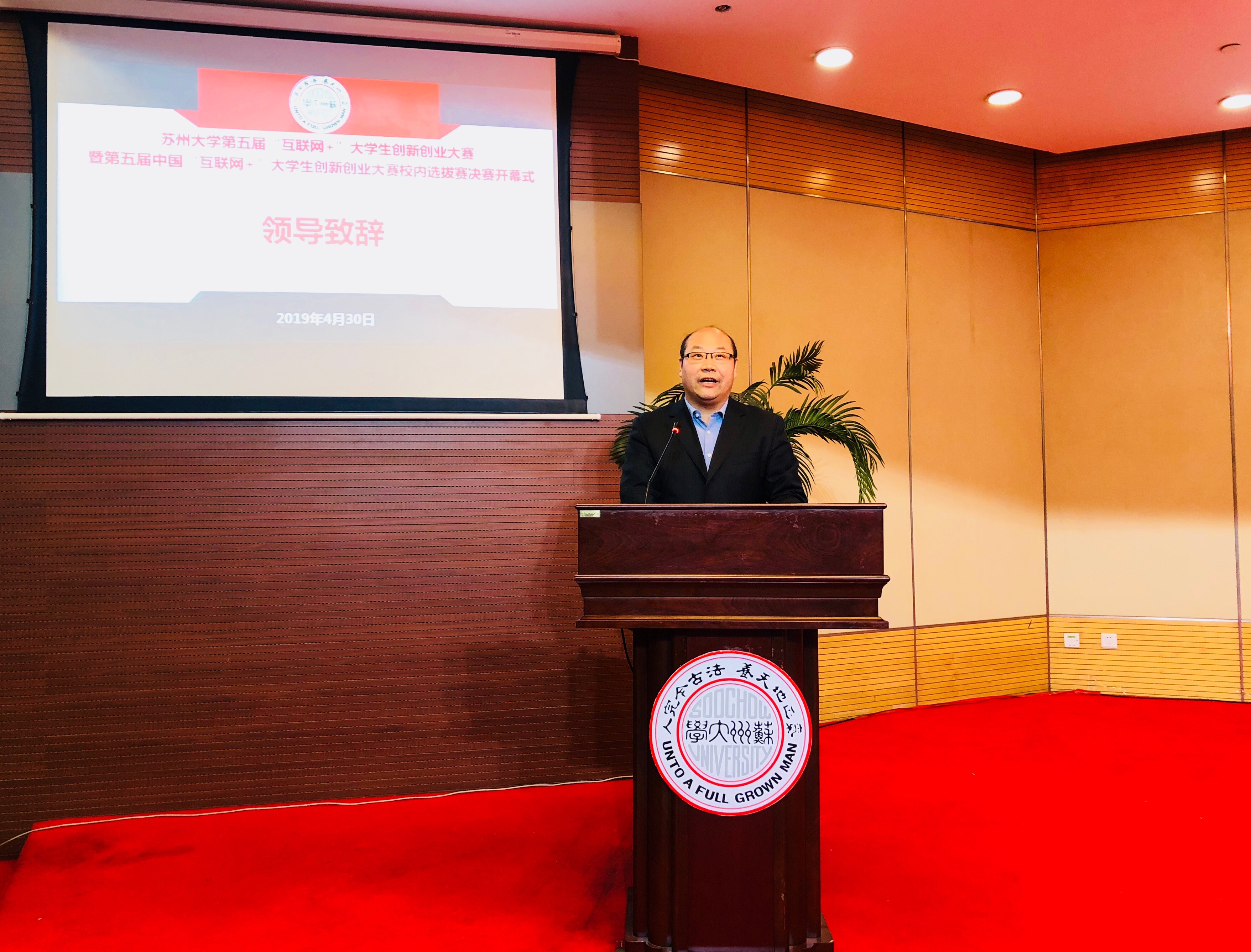 2019年4月30日,苏州大学第五届“互联网+”大学生创新创业大赛暨第五届中国“互联网+”大学生创新创业大赛校内选拔赛决赛在炳麟图书馆学术报告厅举行。校党委常委、副校长刘标出席开幕式并致辞;学校相关职能部门负责人、各学院(部)分管领导、辅导员、项目指导老师、入围决赛项目团队及学生代表参加了本次比赛。大赛特邀具有丰富评审经验七位专家担任评委,肖平代表评委组致辞。决赛开幕式由学生工作部(处)部(处)长、创新创业教育中心主任(兼)孙庆民主持。