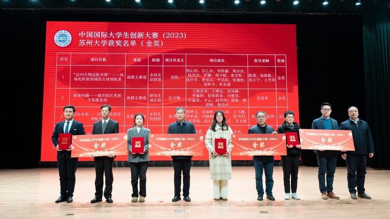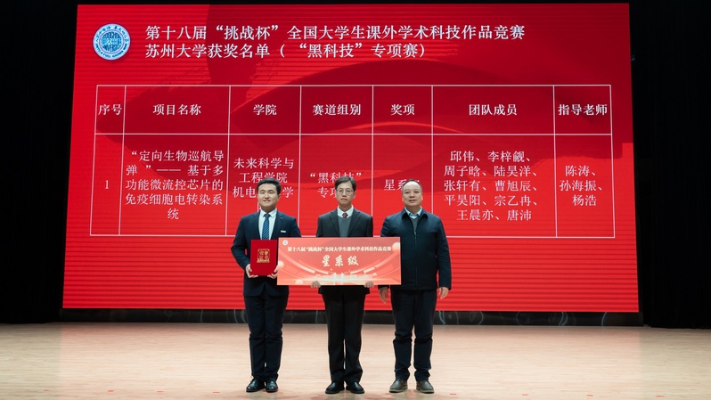 会上,对“三大赛”省赛、国赛获奖项目进行了表彰。在第十八届“挑战杯”全国大学生课外学术科技作品竞赛中,主体赛共有《碳离子响应的非编码RNA对乏氧肺癌细胞的放射敏感性的调控作用及机制研究》等8个项目获奖,“黑科技”专项赛共有《定向生物巡航导弹》等3个项目获奖,红色专项活动共有《红色之河——以京杭大运河看苏州革命岁月的红色印记》1个项目获奖,“揭榜挂帅”专项赛共有《基于结构和计算模型的SARS-CoV-2病毒分子进化模式研究》等4个项目获奖。在中国国际大学生创新大赛(2023)中,高教主赛道共有《新新向融——城市街区更新全案服务商》等5个项目获奖,产业命题赛道共有《破“景”重圆——助力未来显示的高效自修复发光薄膜》等2个项目获奖。