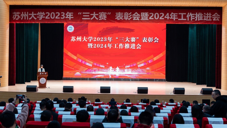 为表彰先进、总结经验,进一步推动学校学科竞赛,1月12日下午,苏州大学2023年“三大赛”表彰会暨2024年工作推进会在天赐庄校区存菊堂举行。校党委常委、副校长姚建林,相关职能部门及直属单位负责人,各学院(部)竞赛工作领导小组成员,创新创业教育实践基地代表,获奖团队代表及指导老师,各学院学生代表参加会议。