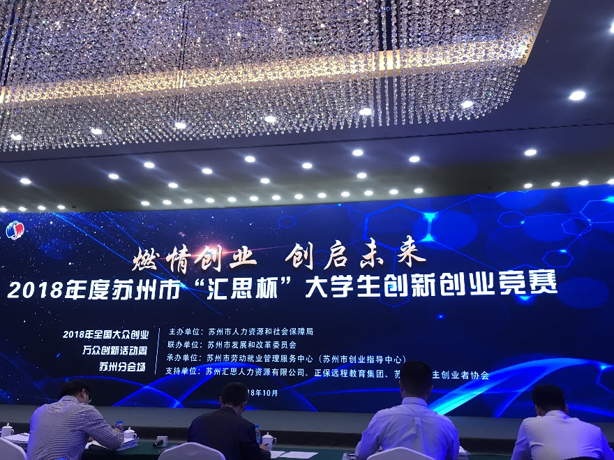 为贯彻落实习近平新时代中国特色社会主义思想和党的十九大精神,促进高校毕业生多渠道就业创业,鼓励创业带动就业,进一步激发高校毕业生创新创业热情,展示高校创新创业教育成果,搭建大学生创业者展示交流的对接平台,10月12日下午,由苏州市人力资源和社会保障局主办的2018年全国大众创业万众创新活动周苏州分会场活动暨2018年苏州市“汇思杯”大学生创新创业竞赛在相城区在水一方大酒店举行。苏州市发改委、人社局、教育局等单位领导,社会创投机构,在苏各高校领导,高校就业创业指导站负责人,大学生创业代表参加此次活动。