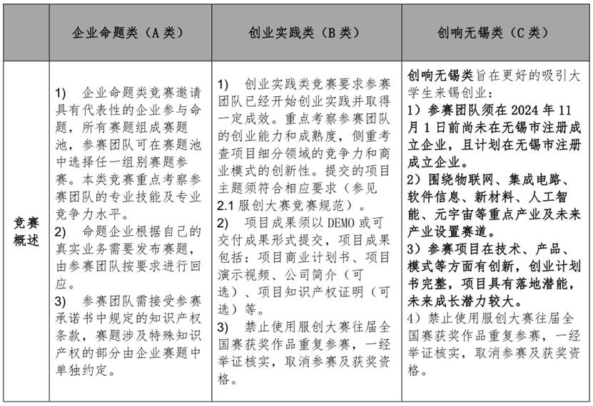 设置三个竞赛类别,分别是企业命题类(A 类)、创业实践类(B 类)和创响无锡类(C 类)。A 类侧重企业命题,通过企业发布真实项目需求,由高校提供响应方案的方式,来加强校企结合及提升产业对接;B 类侧重创业实践,鼓励具备成熟度的创业团队和项目参赛,要求参赛项目已经取得一定成效;C类侧重在锡落户,要求项目契合无锡产业发展方向,并有落户意向。